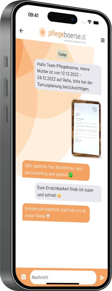Wir übernehmen die komplette Organisation Ihrer 24-Stunden-Betreuung. Mit unserer App behält die gesamte Familie den Überblick über Betreuer und Turnusplanung. Zudem haben Sie die Möglichkeit, noch vor Beginn mit Ihrer Betreuungskraft zu telefonieren.